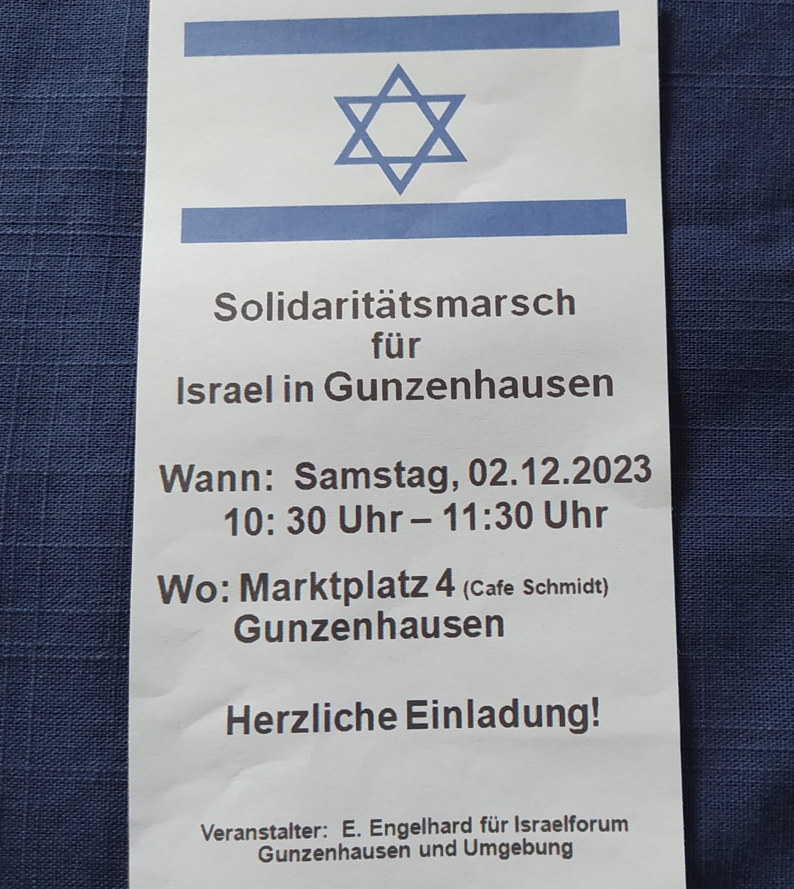 Der Krieg der Terrorgruppe Hamas gegen Israel schockt nach wie vor auch viele Menschen in Mittelfranken. In Gunzenhausen soll es dazu am Samstagvormittag einen pro-israelischen Solidaritätsmarsch geben. Veranstalter sind das Israelforum Gunzenhausen und Umgebung und Elvira Engelhard:
